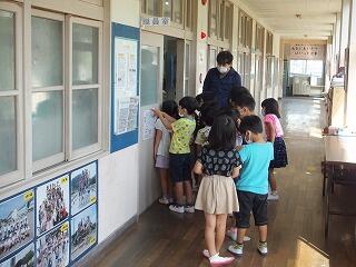 5月20日(水)、1年生は1校時に「学校探検」、2校時には「日南キューブ」に取り組んでいました。学校探検では、いろいろな教室を回って、どんな教室に、どんな先生たちがいて、どんな仕事をしているのかなどを担任の先生から聞いていました。校長室に来た1年生は、歴代の校長先生の写真を見て、たくさんの写真にびっくりしていました。