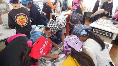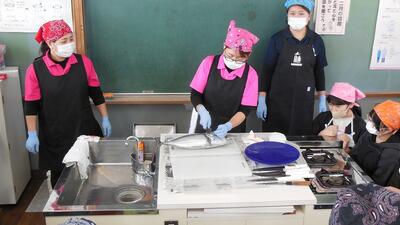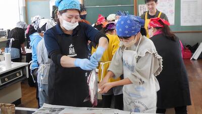 6年生は、漁協の女性部の方々の協力をいただき、「かつおめし」づくりに挑戦しました。さすがに、さばくのは難しかったですが、やさしくていねいに教えていただき、おいしくいただくことができました。