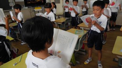 1年生は、国語の時間に、詩の朗読 を熱心に行っています。