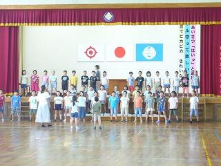 子どもたちが飽きないように紙芝居を見せたり、校長先生に演技をしていただいたりしながら歌うなどの工夫をしてくださいました。