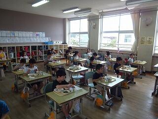 学校再開に合わせ、給食も再開しました。やはり温かい給食はおいしく、ありがたいものです。まだみんな前を向いて食べていますが、グループでおしゃべりをしながら、食べられるように、早くなるといいですね。