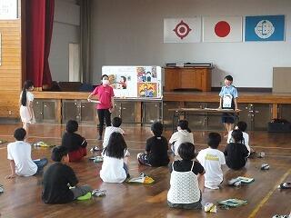 6年生が、5校時に体育館で「非行防止教室」を行いました。日南警察署とスクールサポーターの方に来ていただき、「万引き」について寸劇や講話をしていただきました。万引きをして捕まったときの自分の気持ちや保護者の気持ちを考えた後、万引きとはどのような犯罪であり、どんな罰を受けなければならないかなどを教えていただきました。また、「万引きをしよう」と誘われたときの断り方も教えていただきました。