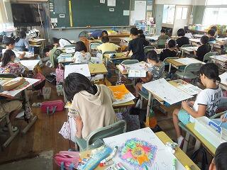 4年生が図工で、「まぼろしの花」という絵に取り組んでいました。誰も見たことも聞いたこともないまぼろしの花を想像して描くのですが、花びらが一枚一枚違った色の花があったり、虫を食べる花があったりと、想像豊かに描いていました。