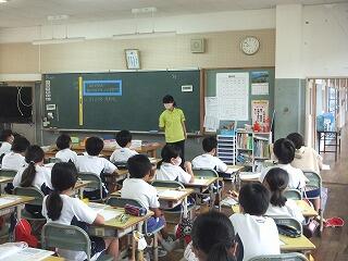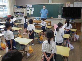 7月16日 木曜日 一年生は、初めて英語の学習をしました。アメリカから クリス先生が来て 油津小学校で教えてくれるのにびっくりしていました。クリス先生の自己紹介を聞いた後、自分たちの名前を言いました。色の学習もして、黒板に貼った色の中から消えた色を探す色あてゲ-ムもしました。とても楽しかったです。