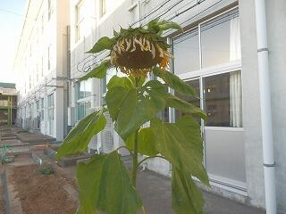 12月になり、とても寒くなりました。ふと花壇を見ると夏に立派に咲き誇ったひまわりがまた咲いています。こぼれだねが何もしないのにこんなに大きく育ちました。普通寒くなると小さく細いひまわりが咲くのですが、夏の頃に負けない大きさです。とっても根性があるひまわりです。大切に種まで頑張って育てたいと思います。