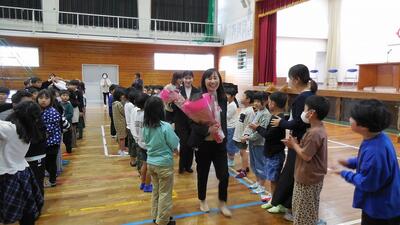 令和5年度の離任式が無事おわりました。令和5年度は、3名の先生方が油津小学校を去ることになりました。それぞれの先生方からお別れの挨拶をしていただきました。卒業生の代表児童が、一人一人の先生方への心あたたまる発表をしてくれました。本当にありがとうございました。退場する時は、児童の皆さんの間を通って、たくさんの励ましの言葉をかけてもらいました。ありがとうございました。