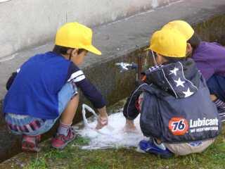 2年生が生活科の時間にシャボン玉を作って飛ばしました。