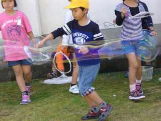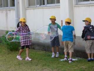 手作りの液で大きなシャボン玉ができて、子どもたちは大