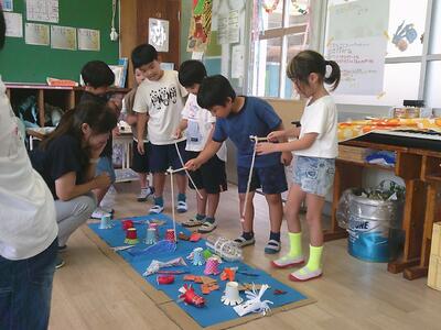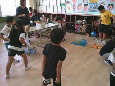 2年生が生活科の学習で、身の回りの物を使っておもちゃを作り、「おもちゃランド」を開いて、1年生を招待していました。