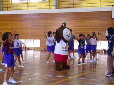 体育館中に歓声が響き、子どもたちはむぅちゃんと一緒に元気いっぱいダンスを踊りました。