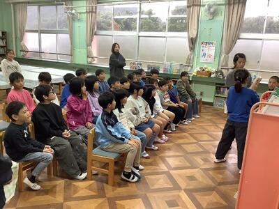 13日の昼休み、図書委員会が3・4年生に読み聞かせを行いました。