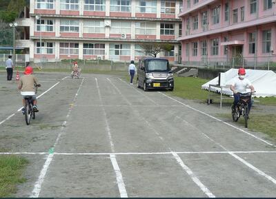 正しい自転車点検の仕方を学んだ後、児童全員で安全に自転車に乗る練習をしました。