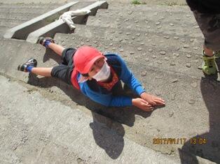 ・ 昼休み時間に、外の階段のところで横になって友達がボール遊びをするのを眺めている児童がいました。寒いから日光に当たっていたそうです。