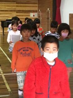 ・ 終業式を終えて教室に戻る様子です。きれいに並んで無言での移動です。よく守れています。