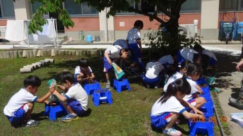 今日は、とても良い天気です。そんな中1年生が朝顔の種をまきました。