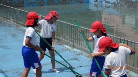 夏を思わせる今日、プール清掃を4・5・6年生が行いました。