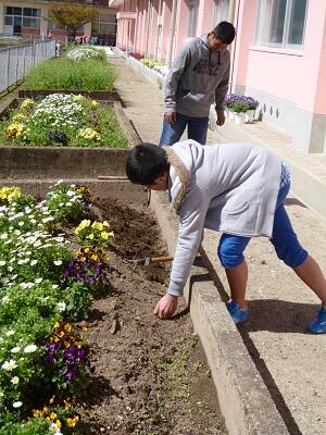 ・下の二人の児童は、花壇の除草をしていました。学級でもやったらしいのですが、完璧にするために引き続きしているとのことでした。