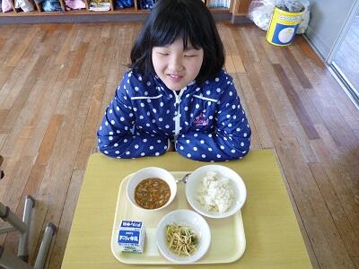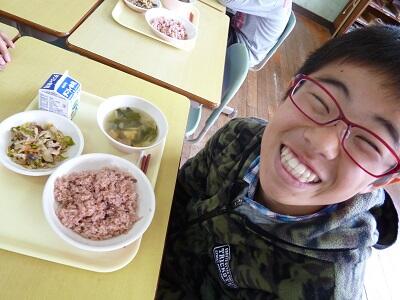 ・15日の給食は、中学校の卒業式の前日と言うことで「お祝い献立」でした。メニューは(赤飯、ごま塩、牛乳、けんちん汁、豚肉のピリ辛炒め)中には、赤飯の苦手な児童もいましたが、多くの児童がおいしそうに食べていました。写真の6年生は、小学校の教室で給食を食べるのはあと一回です。