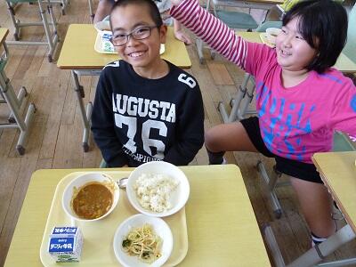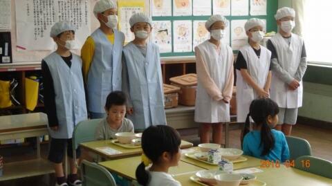 今日から1年生の給食が始まりました。6年生が準備している間、1年生は静かに待つことができました。みんな残さずおいしそうに食べていました。