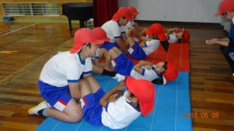 5年生は、消防署の分衛(わけい)さんの指導のもと、宿泊学習(青島少年自然の家 5/20~5/22)で披露するエイサーの練習を行っています。