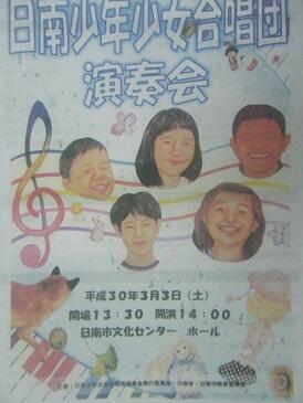 ・3日土曜日に、今年発足した日南少年少女合唱団のコンサートが文化センターにて開催されました。この合唱団には、本校から4,5年女児が各一名入団し、練習に励んでいます。また、職員も1名、指導に努めています。一回目のコンサートでしたが、きれいなハーモニーと演出でおよそ1時間20分のコンサートを存分に楽しむことができました。入団可能な子供さんにはおすすめです。