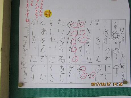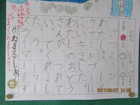 ・ 夏休みの絵日記が壁に貼られていました。写真は一年生のものです。文章もわかりやすいし、文字もとても丁寧ですね。