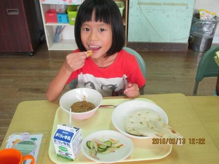 ・ 昨日の給食には「ナン」が出ました。一年生には、あらかじめ担任が食べ方を説明していましたが、すでに知っている児童もいたようでした。少し珍しいメニューの給食タイムを楽しみながら完食していました。