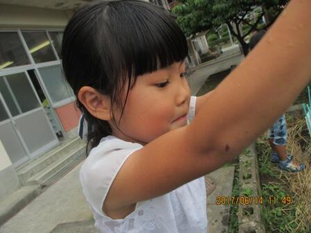 ・ 低学年は植物を栽培しています。1年生は、一鉢ずつあさがお、それに畑で野菜を育てています。2年生は一鉢ずつミニトマトを育てています。毎日、観察をしながらペットボトルで作ったジョーロで水やりをしています。畑には、すでになすびがなっていました。