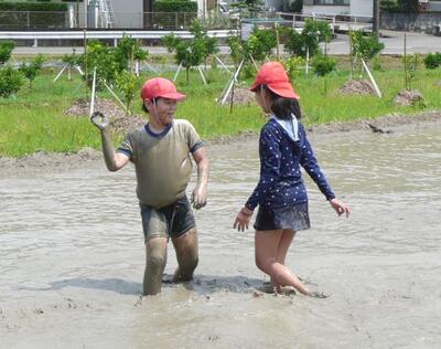 本日6月3日(金)は、「代かき」を行いました。児童は、どろんこになって田んぼを耕しました!