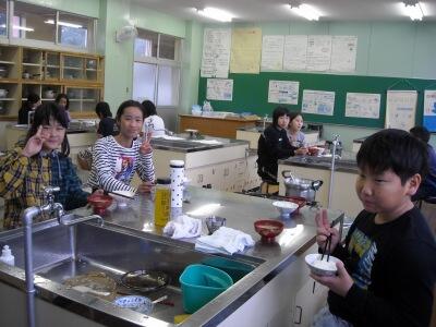 家庭科で「ご飯と味噌汁」を作りました。どのグループも上手に美味しい料理が協力してできました。笑顔、笑顔の会食会でした。
