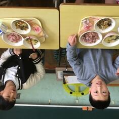 赤飯、ごま塩、牛乳、かき玉汁、牛肉のしょうが炒め、お祝いクレープ