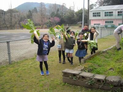1年生が生活科園で育ててきた「ダイコン」の収穫をしました。一人ひとりが気合いを入れて、「うんとこしょ どっこいしょ!」と引き抜いていきます。全員満面の笑顔です。全部で63本収穫できました。写真撮影のかけ声も「うんとこしょどっこいしょ!」でした。