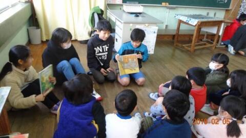 4年生は3年生に5年生は2年生にそして6年生は1年生に読み聞かせを行いました。グループに分かれたり一斉に行ったりしていました。下の学年のみんなに聞いてもらうために、読む練習も行ってきました。聴いている学年のみんなも楽しそうでした。