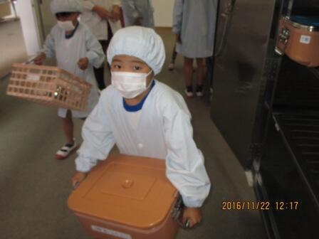 ・ 1年生はすでに給食当番のほとんどを自分たちだけでやっています。大きな食缶やおぼん、食器のはいったかごを運ぶのは大変です。でも、「うんとこしょ」と言って運ぶ児童はいませんが、そんな感じで大きな食缶などを運んでいます。