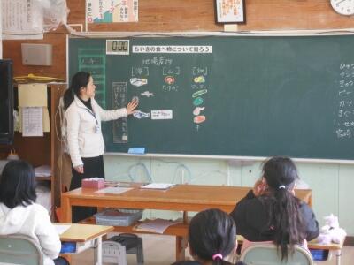 今日は4年生のクラスで「食育」についての学習を行いました。めあての地域の産物について学ぶことができました。油津小学校から栄養教諭の河野先生もTTとして参加していただきました。