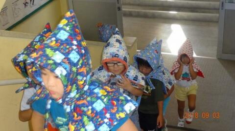 朝、一番に避難訓練を実施しました。地震が起こり、それから津波が来るとの想定でした。全員が防災頭巾をかぶり、三階の音楽室まで避難しました。今、どんな災害が起こるかわかりません。常に、災害に対してどのように行動したらよいかを考えることのできる子になってほしいです。
