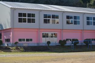 ・ まだ使用は出来ませんが、体育館もほぼ完成しました。外壁の半分は校舎と同じピンク色です。「ピンクの桜ケ丘小学校」、現在の職員と常任委員が票を投じて決めたピンク色です。
