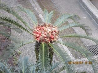 ・ 校内のソテツに実が出来ています。以前は、これに細工したものが「子供の国」に売っていました。猿の顔が描かれ、中に玉のようなものが入っていて、音が鳴るものです。今でも売ってあるのかどうか、子供が大きくなり、ここ十数年行ったことがないので定かではありません。
