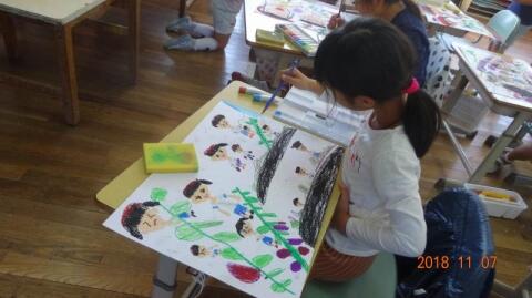 2年生が先日行った芋掘りの様子を絵に表していました。一生懸命に芋を掘っている姿を表情豊かに描いていました。今度の、芋の収穫祭が楽しみです。