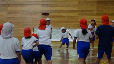 昼休みに子ども達が学年入り交じって遊んでいました。前回、全校で行った「ドッチビー」を使ってとても楽しそうに遊んでいます。
