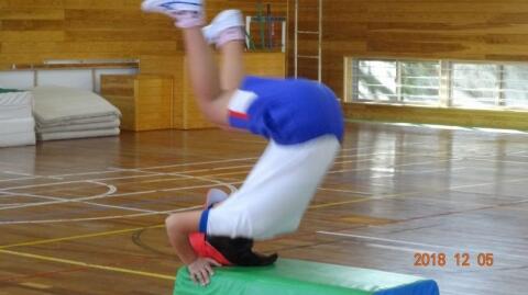 4年生が、台上前転の練習をしています。できない児童は、どうしても怖さがあり腰がなかなか上がりません。練習を繰り返し行うことで怖さを克服してできるようになります。これからも、いろんな飛び方にチャレンジしていきます。