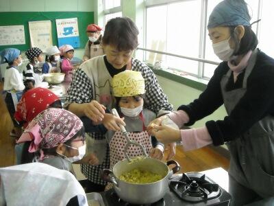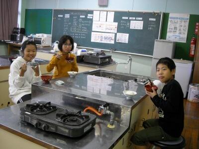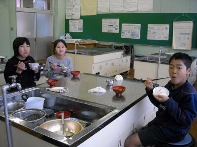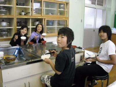家庭科で「ご飯と味噌汁」を作りました。どのグループも上手に美味しい料理が協力してできました。笑顔、笑顔の会食会でした。