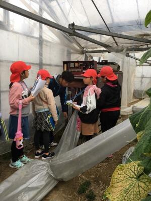 3年生の社会科の学習「農家ではたらく人々」で、北郷にあるきゅうり農家の木佐貫さんのハウスに行ってきました。きゅうりを育てる上での工夫や苦労を学びながら、実際にきゅうりの収穫体験もさせて頂きました。