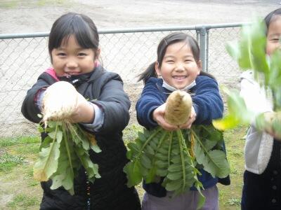 1年生が生活科園で育ててきた「ダイコン」の収穫をしました。一人ひとりが気合いを入れて、「うんとこしょ どっこいしょ!」と引き抜いていきます。全員満面の笑顔です。全部で63本収穫できました。写真撮影のかけ声も「うんとこしょどっこいしょ!」でした。