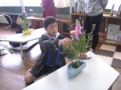 今日の「いろいろ体験クラブ」では、「生け花」にチャレンジしていました。日本の伝統文化・芸能をしっかり学びました。