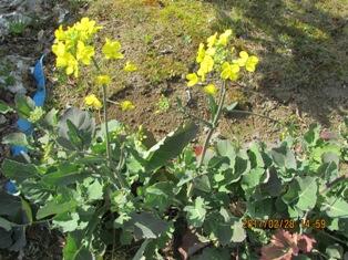 ・ 昼間の陽気に誘われるように、なのはな(アブラナ)の花が咲いていました。このなのは、桜ケ丘地区の方から、「苗を作ったのでいりませんか」と声をかけていただき、いただいたものです。校舎から体育館までの間のすみと、玄関前花壇に植えています。もう春ですね。