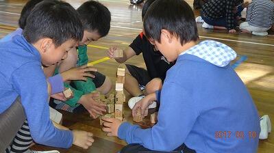始めにグループを作って自己紹介を行いました。その中で、自分の好きな形や遊びなどの紹介を行いました。グループ作りは何度か繰り返しました。始めは、なかなかうまくいきませんでしたが自然とグループができるようになりました。やっぱり、子どもは順応性が高いですね。そのあと、日南キューブを使って高さ比べをしました。グループの仲間と協力して積み上げていました。5年生になると、油津小との合同宿泊学習があります。その時が、今から楽しみです。