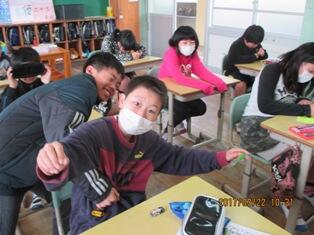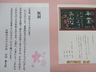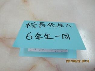 ・ 6年生が手紙をくれました。分担してすべての職員、全校児童に配ったそうです。心のこもった想定外のプレゼントでした。写真の児童は、私に配付してくれたグループの子供達です。ありがとう。