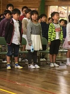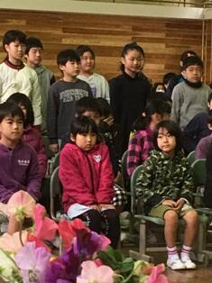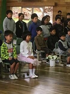 ・ 今日はお別れ遠足です。たった今、体育館での「送る会」が終了しました。会では、学級ごとに6年生への贈り物の「ダンス」「ミニ劇」「歌」「言葉」「手作りのプレゼント」などがありました。どの学級の贈り物も大変工夫をされていて、子供たちも精一杯の力で発表してくれました。一学年一学級の本校では、日頃から学年の枠を越えた交流が活発です。ですから、6年生が卒業するとなると、在校生にとっては本当に寂しい気持ちになるんでしょうね。それが分かるような、心のこもった精一杯の贈り物でした。最後に、6年生一人一人が前で挨拶をしたのですが、これも立派、表現力が育っていることがよく分かった挨拶でした。