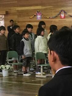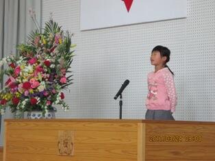 ・ 代表で1年児童が話をしてくれました。だいぶ練習したと思います。何も見ないで堂々と話をしてくれました。話の中に「新入生にいろんなことを教えてあげたい」と言う優しい言葉もありました。ありがたいです。